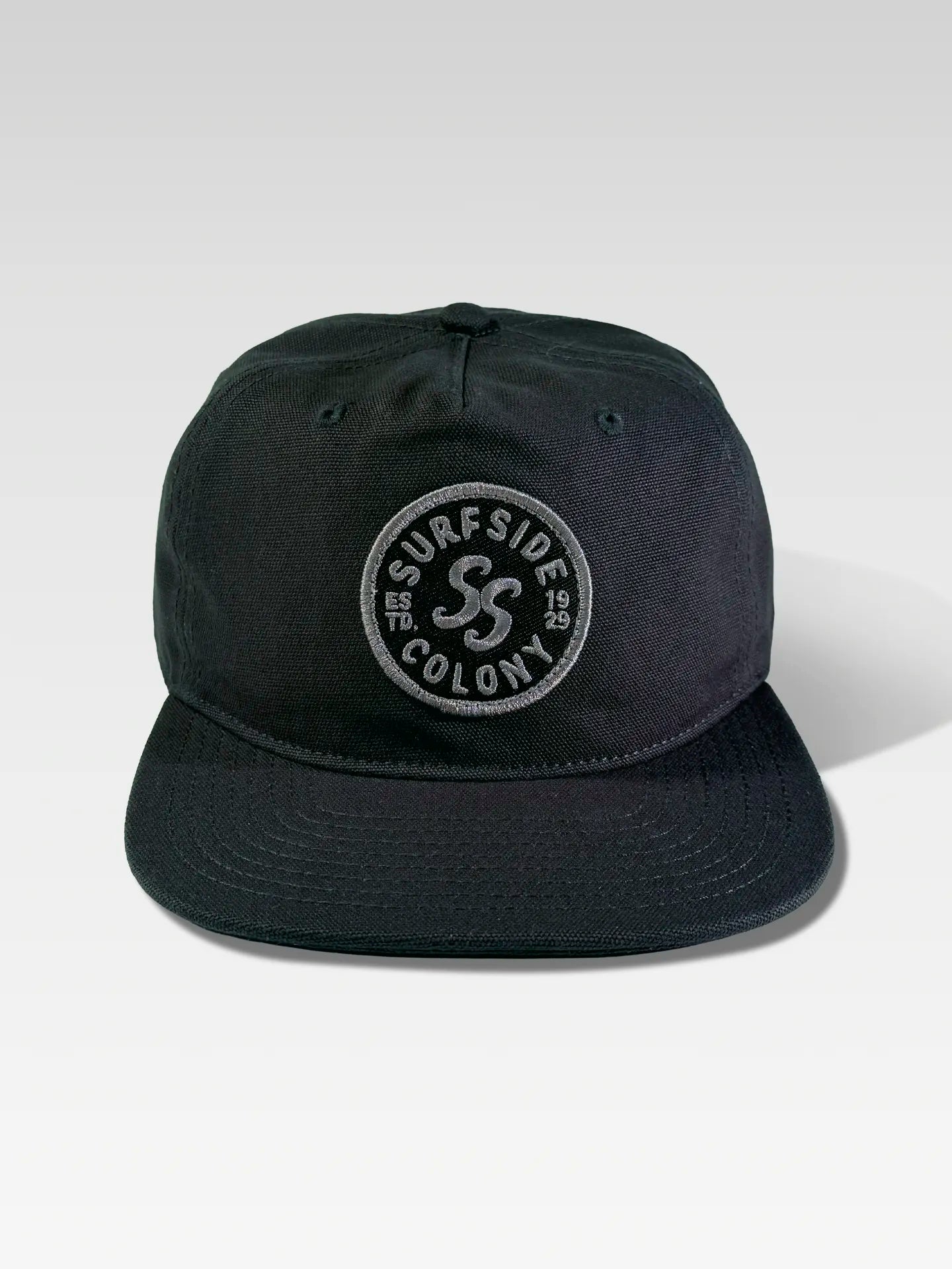 Rep the classic beach community — Surfside Colony with this sleek gray-on-black embroidered patch on dark gray cap. This unique cap is crafted from heavy-weight 100% cotton canvas. Features a mid-profile, unstructured 5-panel cap with flat peak and snapback enclosure — designed for locals who know. One size fits most.